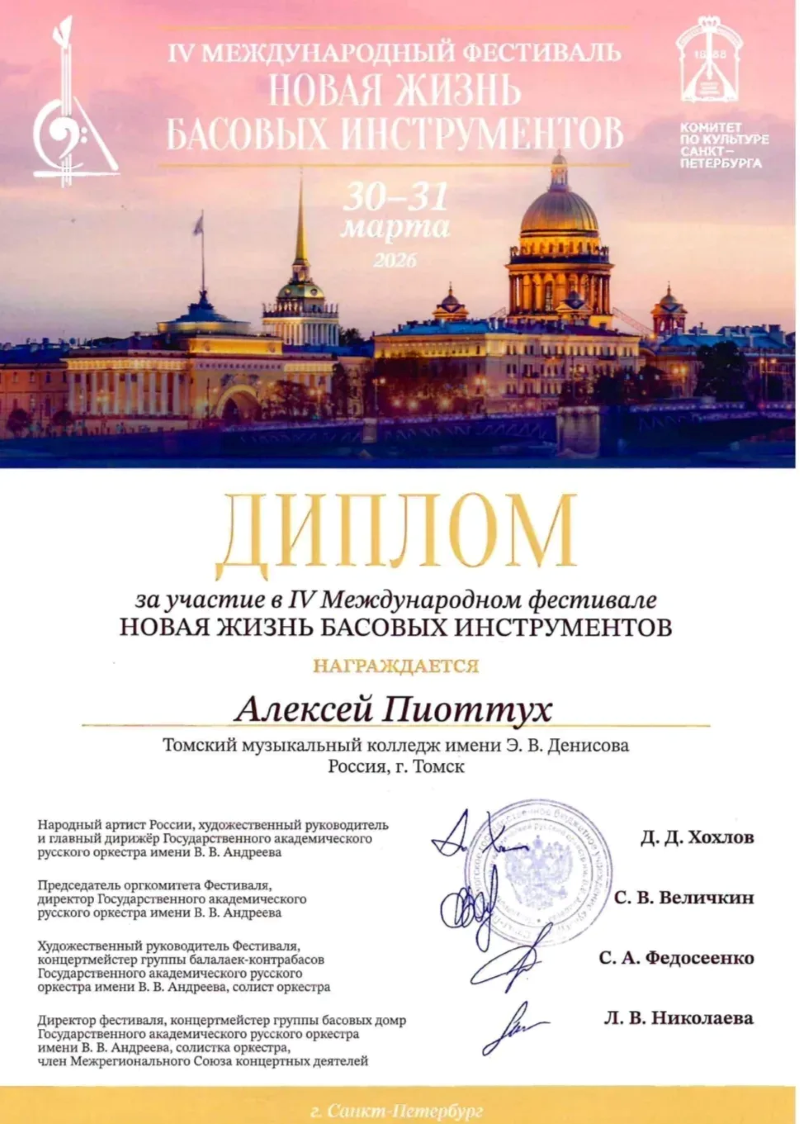Музыкант Джаз оркестра «ТГУ-62» Алексей Пиоттух представил Томскую область на IV Международном фестивале «НОВАЯ ЖИЗНЬ БАСОВЫХ ИНСТРУМЕНТОВ» в Санкт-Петербурге.